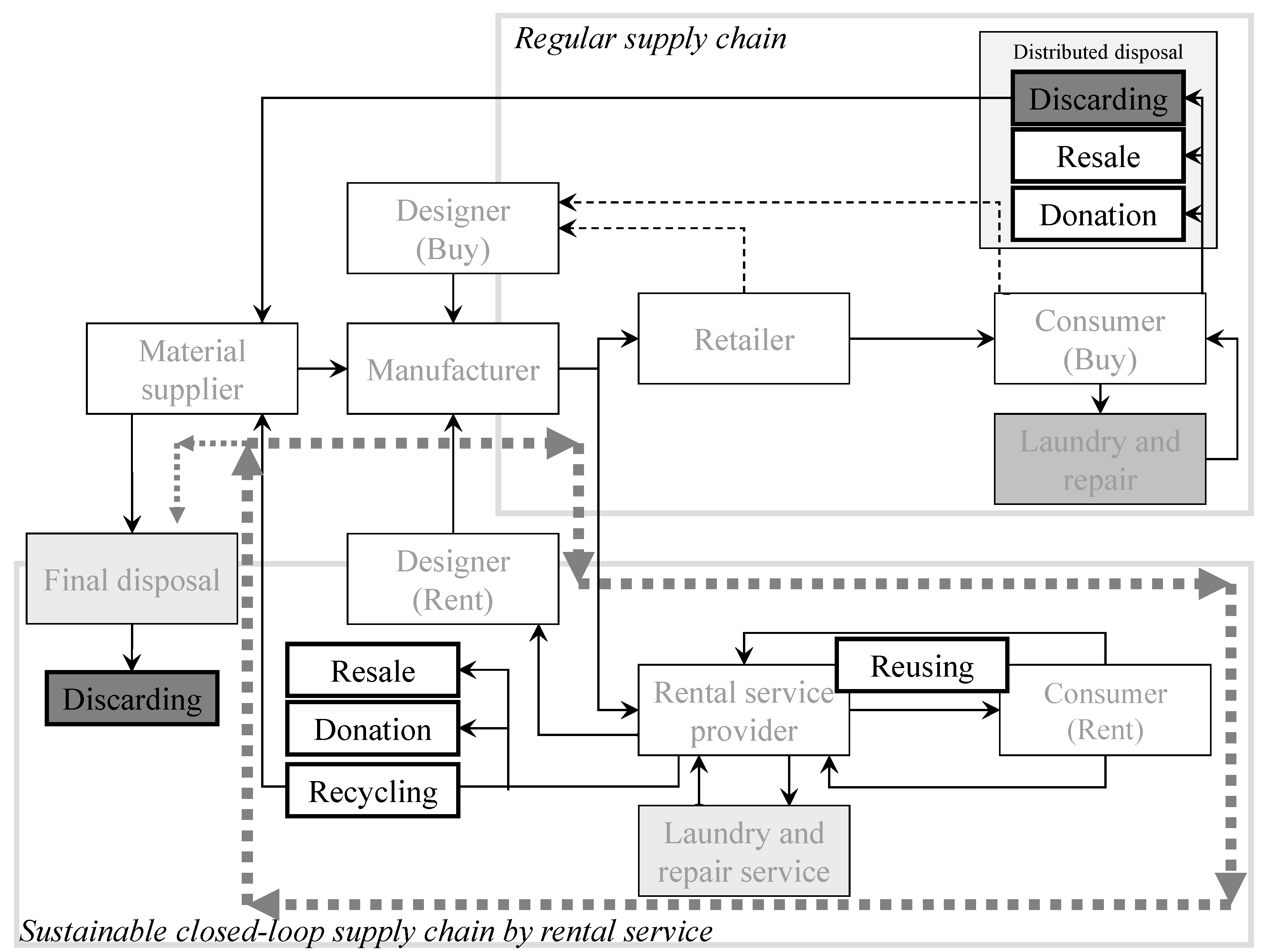 Figure 2 presents the five disposal options [31] in the supply chain: resale, donation, reusing, recycling and discarding. In the regular supply chain, the used fashion products may be disposed by donation, resale and discarding. As studied by Joung and Park-Poaps [31] and Bianchi and Birtwistle [1], the diverse consumer behaviors play important roles in the disposal. In developing countries, when the donation bins and charity shops are not well set, the convenience concerns may result in the disposal behavior. However, the rent-based supply chain instinctively serves for reusing the products, although finally, the products are discarded in batches under good control. The rental service itself is a way of reusing, and the final recycling is also an extension of reusing. In the aspects shown in Table 2, the rent-based supply chain provides the feasibility of scaled disposal, such that the sustainability modes and technologies can be efficiently used with low costs.