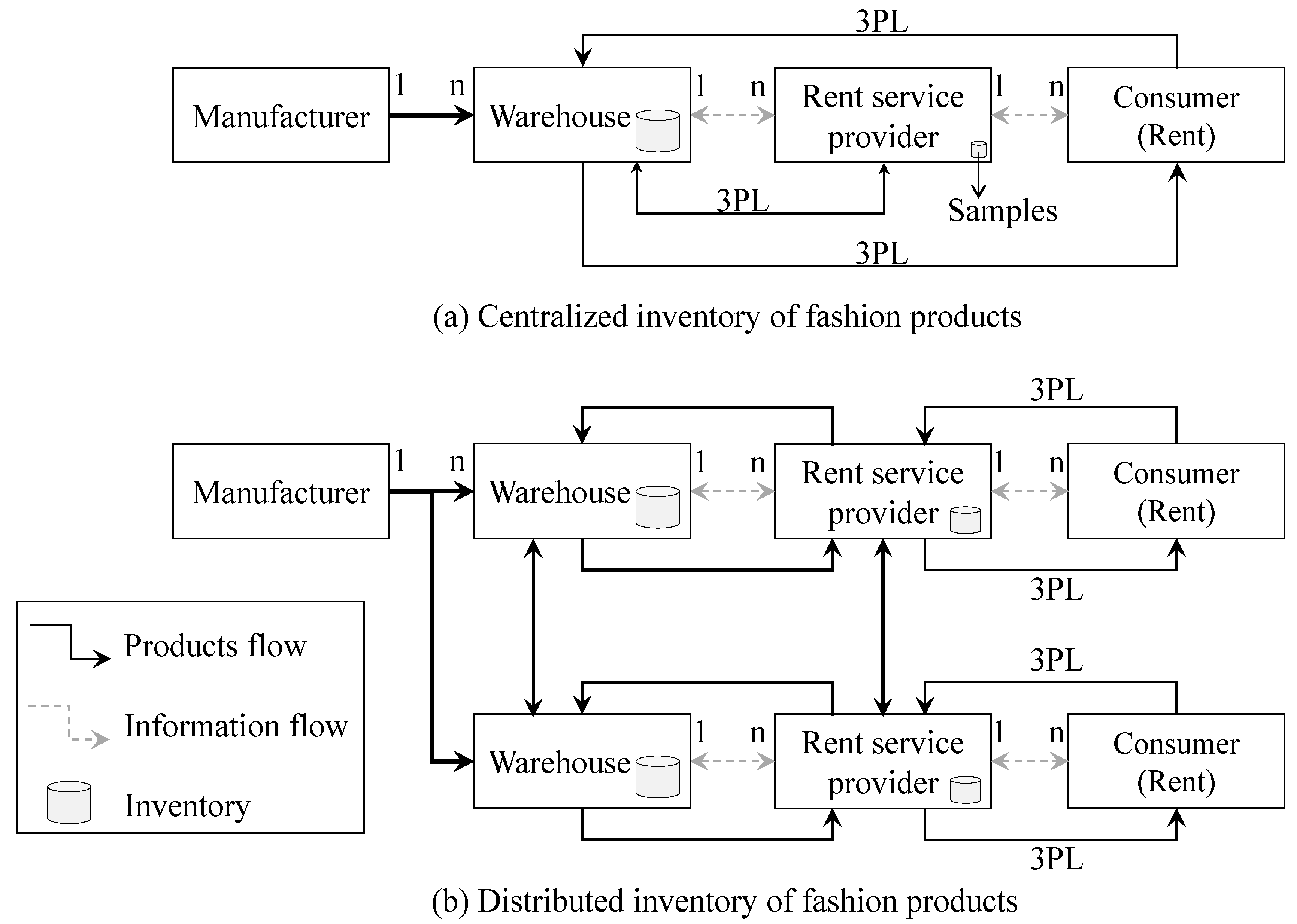 Rental service has become a popular option, mostly because it does not require substantial upfront costs, and regular maintenance is often handled by the lessor. Here, the term, rental service, refers to the service provided to manage the leasing process of fashion products in the perspective of supply chain management. Kuo [14] took the office copy machine as an example to propose a maintenance service based on rental services. The provided service includes maintenance, recycling, reverse logistics and final waste disposal. Degl’ Innocenti and Girardone [15] provided evidence on the cost advantages of leasing companies by focusing on ownership structures and diversification strategies. The results suggested that cost efficiency and economies of scale have decreased significantly over the period analyzed. Diversification strategies are crucial in determining the cost effectiveness of leasing firms. Nonetheless, smaller, independent and less diversified leasing firms appear to benefit from high economies of scale and great technological advancements. Degl’ Innocenti and Girardone [15] examined the ownership, diversification and cost advantages based on the evidence from the Italian leasing industry.