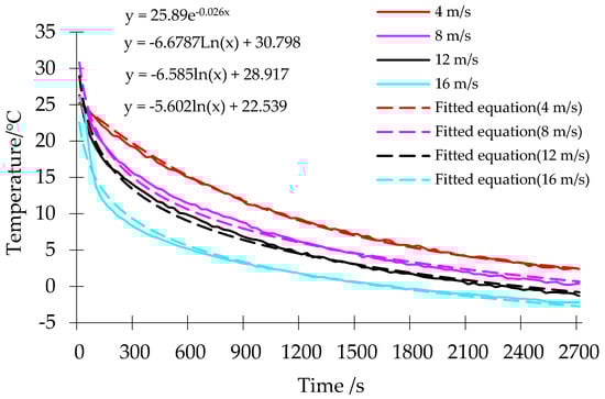 Appropriate boundary conditions must be exactly established in this model. The fan outlet was assumed to be the velocity inlet, and the outlet was assumed to be the pressure outlet. Velocity was constant in both inlets as per the boundary conditions for Equations (1) and (2). Velocity in the fan outlet could be stated as υx = 0, υy = υ, υz = 0. In this model, υ was calculated on the basis of Equation (1). The UDF was used to represent the change of inlet temperature with time under different velocity levels, and data were experimentally obtained (Figure 2). For the produce space, υ was affected by the resistance of the produce and its package; this resistance was calculated by using Equation (3). Boundary condition details are shown in Table 2. Viscous resistance and inertial resistance were obtained by measuring the products’ ventilation resistance, which was represented by the pressure difference in different velocity, and then it was synthesized to a one variable quadratic equation with no intercept. The hole rate is 0.3, viscous resistance is 19,441, and inertial resistance is 0.05891 by measuring and calculating. Due to the impact of forced convection intensity, the inlet temperature of the fan varied with time, the entry boundary cannot be set to the same parameter. Thus, relationship between the air velocity and inlet air temperature, and a user-defined function (UDF) between the two was added into the model. The heat load outside the container was also considered, and its heat transfer coefficient was calculated to 0.13734 W/m2K by Equation (6) to Equation (10). Average temperature of outside the container within 45 min was tested to represent the wall temperature in the CFD model.