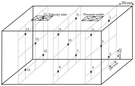 Experiments were carried out in the ITCC (1:1 scale as the container) with cold-storage and temperature-control transportation. These experiments served to verify the accuracy of the simulation models. Temperature and air velocity were recorded by fifteen thermocouples and fifteen hot wire anemometers respectively. On the basis of the results of a previous analysis, the locations of these sensors were determined and are shown in Figure 3. Thermocouples (CHT-D version) with a measuring range of −20–80 °C and accuracy of ±0.3 °C were used. Hot wire anemometers (CHWVN WD4150) with a measuring velocity range of 0–30 m/s and accuracy 0.02% of the read value and resolution of 0.01 m/s were used.