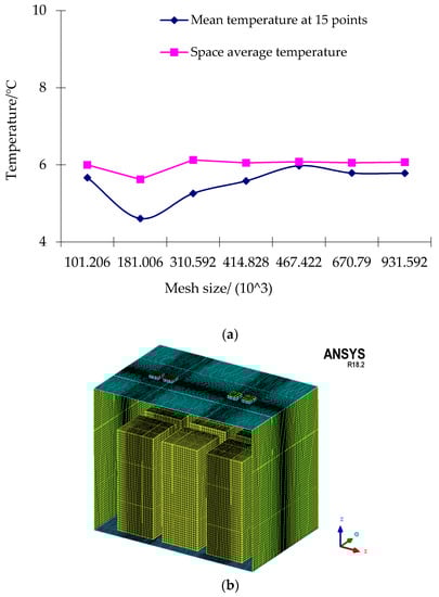 Figure 3 shows the schematic of measuring points. Figure 4a shows the average temperature of 15 measuring points and space average temperature in ITCC. Average temperature fluctuated slightly as the number of cells changed from 100,000 to 500,000. It was also obvious that there was a gentle velocity incline of the monitor sensor in the area from 670,000 to 950,000, which testified that the number of cells in this area was suitable for simulation in FLUENT. Considering the computational power requirement, a smaller number of cells was selected in this task. A 3D mesh file with 670,000 cells was constructed for this research. The mesh model is shown in Figure 4b.