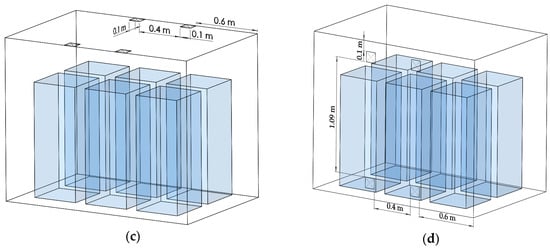 Four groups of air velocity and four groups of fan locations were selected for numerical analysis to optimize temperature distribution in the container. Air velocity was 4, 8, 12, and 16 m/s, respectively. The specific locations of the fan are shown in Figure 5. In all cases, the same parameters, solution method, initial conditions, and boundary conditions were used.