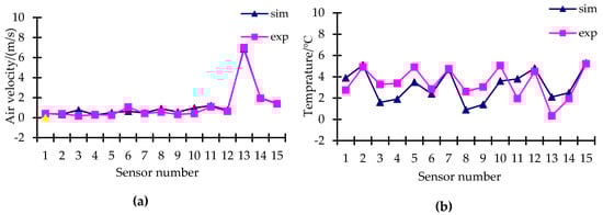 Comparison of simulation and experiment: (a) temperature and (b) air velocity.
