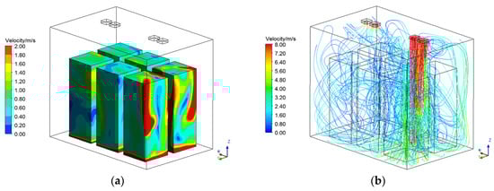 Air velocity is a significant factor that affects produce quality, especially weight loss. Figure 7 shows air-velocity distribution and air streamlines in the ITCC. As can be seen from Figure 7a, high velocity on the produce surface was below the fan outlet and the bottom of the produce. High velocity below the fan outlet might have been caused by direct blowing. Air from the fan outlet rushed to the floor of the container and spread along the bottom guide rail to other areas of the bottom, resulting in higher velocity at the produce bottom. According to the study of Ambaw et al. [] on the velocity distribution of apple refrigerators, air flow blown out by a front cooling device also had higher local velocity when reaching the opposite wall, which is consistent with the analysis results in this paper. Low velocity could be seen near the outlets, far from the door. Figure 7b shows the air streamlines, which perfectly explain the reason for this velocity field. Uniform air-flow distribution could effectively improve heat-exchange efficiency in the container and reduce the quality attenuation of goods due to large local air-flow velocity, and it was more conducive to ensuring the quality uniformity of the transported goods.