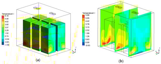 Temperature is another significant factor that affects product quality. Figure 8 shows the temperature distribution in the whole container. The temperature partition in the container is obvious, and there was great temperature difference in the container. Temperature in the area near the fan outlet was lower, while temperature in the area away from the fan outlet was higher, especially far below the fan outlet. Since the cold air could not reach these parts, it resulted in a high temperature region in the products. There were two main reasons for this, one was that these parts were an airflow blind area, the other was that the products blocked the arrival of the cold air. Temperature on the product surface reached 6.18 °C, while it was −1.59 °C near the fan outlet (Figure 8a). Maximal temperature difference on the product surface reached 7.77 °C (Figure 8a), and maximal temperature difference in the rest of the space was 6.31 °C. Uneven temperature distribution led to the fruit freezing in some areas, while the high temperature in some areas may have accelerated the rot of the fruit in those areas. Therefore, it is necessary to optimize temperature distribution in the future.