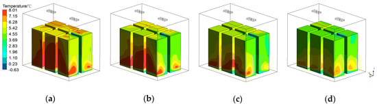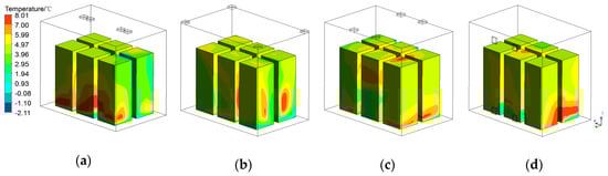 Temperature distribution with different fan locations: (a) L0; (b) L1; (c) L2; and (d) L3.
