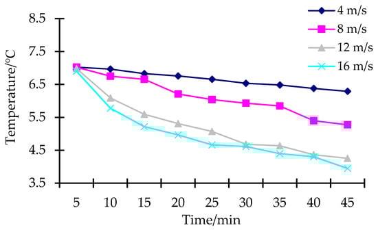 Figure 10 shows the cooling time with different velocity levels, which had an accelerated cooling rate by increasing air circulation. These results indicated that the cooling rate improved with velocity increasing; the cooling range was between 2.05 and 2.95 °C from 5 to 45 min. The cooling capacity release rate of the storage module was affected by forced convection and thermal conductivity [], and the cooling capacity released in a certain period was limited. When air velocity was low, the cooling capacity taken away from the storage area was lower than the cooling capacity released by the storage module, resulting in a high outlet temperature of the fan, thus affecting the cooling rate in the cargo area. With the increase in velocity, the release rate of the cooling capacity of the storage module increased, but the amount of cooling capacity taken away from the storage area could only infinitely approach the amount of cooling capacity released by the storage module. After reaching an equilibrium point, the outlet temperature of the fan was basically constant. When velocity was 4 m/s at 45 min, temperature was 5.27 °C, which was more than 1 °C higher than the three other velocity levels, indicating that the amount of cold released from the storage area was not brought into the product area. The cooling trend of 12 and 16 m/s velocity indicated that the temperature difference in the cargo area in the first 30 min was significantly higher than that after 30 min, indicating that, when air velocity was 12 m/s, the cooling rate of the storage module and the cooling rate brought into the product area by the fan basically tended to be stable. In the forced air-cooling system, energy consumption mainly depends on the power needed to generate the air flow passing through the stack (i.e., fan power) and the time needed to maintain the air flow (i.e., cooling time). For a cooling-storage system, the influence of ventilation velocity on the cooling-release rate of the storage module needs to be considered. When considering the energy consumption of the fan, the cooling rate of the cooling module, and the temperature-field distribution in the product area, we found the 12 m/s velocity level to be better than the others.