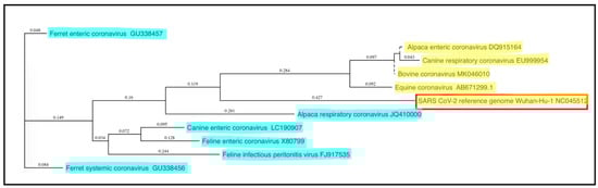Phylogenetic relationships of coronaviruses of companion animals. The 3′ portions of the coronaviral genomes encoding the spike and other non-structural proteins (~9 kb) were compared and plotted as a “guide tree” using MacVector software (ClustalW Multiple Sequence Alignment). Betacoronavirus sequences are highlighted in yellow, while alphacoronavirus sequences are highlighted in blue; the zoonotic SARS CoV-2 coronavirus is surrounded by a red box. GenBank submission numbers are indicated for each sequence.