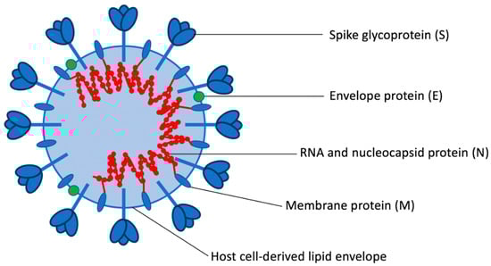 Coronavirus genomes encode three classes of proteins: structural, accessory, and non-structural proteins. Major structural proteins of coronaviruses include the nucleocapsid (N), spike (S), membrane (M), and envelope (E) proteins []. The S protein is the primary viral binding protein and mediator of membrane fusion and viral entry. The N protein, in close association with genomic viral RNA (gRNA), forms the helical nucleocapsid, which is stabilized via binding to the M protein (Figure 2). The viral genome and helical nucleocapsid are surrounded by a host-derived lipid bilayer, in which the S, E, and M proteins are anchored. The transmembrane E and M proteins are involved in virion assembly and budding []. In addition to the four structural proteins, coronavirus genomes also encode a number of accessory proteins. While the roles of most of the accessory proteins remain poorly understood and may be dispensable for virus replication in vitro, certain accessory proteins appear to enhance viral virulence in vivo; for example, the SARS coronavirus encodes accessory proteins that antagonize the development of type I interferon (IFN) responses [].