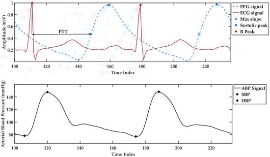 As mentioned in the previous study [], ECG and PPG are the signals that can be used to retrieve the important information for BP estimation. The temporal dependency between the patterns of ECG, PPG, and arterial blood pressure (ABP) signal can be seen in Figure 1. The ECG signal consists of five wave segments P, Q, R, S, and T, while the waveform of the PPG signal describes the systole and diastole of the cardiac cycle. Using these signals, we can derive the PTT value by measuring the time difference from the R peak of the ECG signal to the maximum slope on the PPG signal. On top of that, it is possible to derive other parameters, such as R to R peak interval in ECG, the amplitude of systolic peak, dicrotic notch, and second peaks, and the time interval between beats in PPG so that it is possible to extract more features.