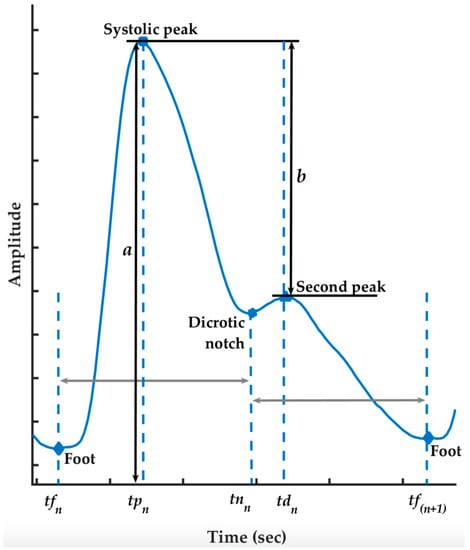 The PPG signal’s quality naturally relies upon the area and the properties of the subject’s skin at measurement, including the individual skin structure, the blood oxygen saturation, blood flow rate, skin temperatures, and the measuring environment. These factors create a few sorts of added substance of artefact which may be contained within the signals which may influence the extraction of features and hence the overall diagnosis, particularly when the signal and its derivatives will be assessed in the algorithm. Taking a dicrotic notch (see Figure 2) as an example, this property is commonly observed from the compliant arteries in the catacrotic phase of subjects but may not appear in the signal due to some occurrences during the acquisition.