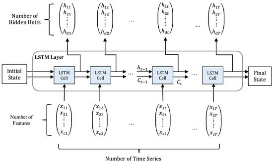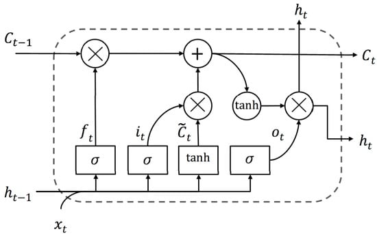 LSTM is an exceptional kind of recurrent neural network (RNN) that is introduced as one breakthrough in handling long-term dependencies by resolving the vanishing gradient problem. A slight nuance between the architecture of RNN and standard LSTM is the hidden layer or the so-called cell []. The core point behind the LSTM success is the memory cell that can preserve its state over time and its nonlinear gating units that thoroughly regulate the information flow [], which is shown in Figure 3.
