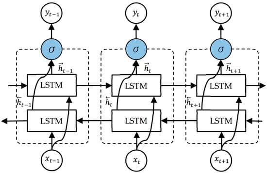 Bidirectional LSTM (BiLSTM) connects the two hidden layers of LSTM to the output layer. Having two LSTM as one layer in the application prompts enhancing the learning long-term dependency and, along these lines, it subsequently will improve the model performance []. A prior study proved that the bidirectional networks are significantly better than the standard ones in many fields [], including the BP estimation case as well []. The structure of an unfolded BiLSTM layer which contains a forward LSTM layer and a backward LSTM layer is illustrated in Figure 4.