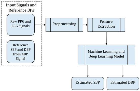 Another approach that assesses blood pressure levels by establishing a PPG morphological feature model has also been proposed []. This method requires a high-quality PPG signal, such as high sampling rates and sampling precision, and it is very sensitive to many kinds of noises. As the acquisition of ECG and PPG signals are popular in clinical settings and can provide more information to the regression model, this research adopts ECG and PPG simultaneously to estimate BP values.