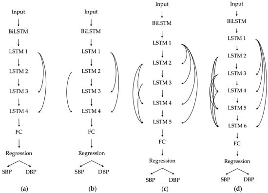 We propose four different LSTM models as well which are shown in Figure 8. All of the proposed models are started by one layer of BiLSTM followed by a series of stacked LSTM layers, a fully connected (FC) layer, and the regression layer as the output. We use BiLSTM in the first layer to fully capture the semantic information of the whole input signal as it takes the input sequence in its original and reverse order []. We then apply a residual connection in the following stacked LSTM layer to overcome the exploding or vanishing gradient problem. The residual connection allows gradients to directly flow through the network without passing a nonlinear activation function whose nonlinearity nature causes the gradients to explode or vanish. The output from the last layer of stacked LSTM is fed into the FC layer and then regresses into two scalar outputs which represent SBP and DBP values. The difference between the number of the LSTM layer and the residual connection is indicated in the performance. These models’ performances will be shown and discussed in Section 5.