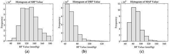 Statistics of the datasets used in the experiments. (a) Histogram of systolic blood pressure (SBP) values, (b) histogram of diastolic blood pressure (DBP values, and (c) histogram of mean arterial pressure (MAP) values.