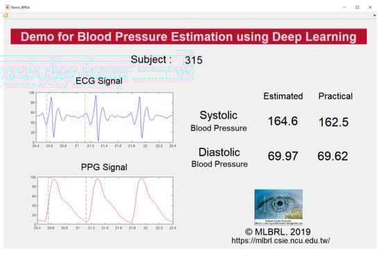 Our proposed models use deep residual connected LSTM layers (number of layers varies from 4 to 6), and BiLSTM is embedded at the first layer in each model (refer to Figure 8). On the bottom of the network, we append an FC layer and a regression layer. For each LSTM and BiLSTM layer, there are 256 hidden layers, with a dropout rate set to 0.2, and the activation function set to ReLU. The initial learning rate is set to 0.003 and will decrease in every 125 periods with a factor of 0.2. The maximal epochs were set to 50. The Adam Optimizer is used in the training process. Figure 10 shows the final real-time demonstration program developed in our laboratory with the subject numbered 315 as an example. Both of the SBP and DBP prediction results (presented as “Estimated”) are showing very small errors to the observed value (presented as “Practical”).