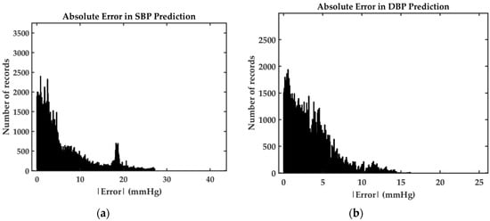 Nowadays, most researchers apply deep neural networks because they allow them to have large amounts of labeled input data and be capable of modeling extremely complex and non-linear relationships between inputs and outputs. For BP estimation, the output layer of the network often consists of two neurons, one for SBP and the other for DBP [,,,]. The metric used for the performance evaluation of the model was mean absolute error (MAE) [,,,,]. Based on [], the authors proposed a regression model based on the deep belief-network (DBN)-deep neural network (DNN) to learn about the complex nonlinear relationship amidst the generated feature vectors obtained from the oscillometric wave and the observed blood pressures.