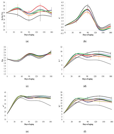 The ionization index (Io-In) in the all wines was around 30% with the wines aged in barrels presenting the lowest values of this index throughout the entire aging process (Figure 3a), but there were no significant differences among the wines studied at the end of the process (Table 2). Somers and Evans [22] observed that Io-In increased with age, indicating that this index ranged from 10–30% in young wines to 80–90% in those with long aging processes. Copigmentation phenomena are defined by many factors, such as the type of anthocyanin and cofactor, the presence of metals, pH and ethanol, among others [29,30]. The color due to copigmented anthocyanins (C) and color fraction due to copigmentation (COP) were significantly different in wines from different systems after 180 days of aging (p value < 0.001). Barrel wines followed by those aged in MOX showed the highest values for both parameters (C and COP), whereas the rest of the aging systems (PDMS, HDPE and StW) had significantly lower values (Table 2). In addition, wines from barrel and MOX systems also presented a higher color due to polymer pigments (Ep), without presenting any statistically significant differences when compared with wines from Ö-HDPE and StW. The evolution of C (Figure 3b) indicated that it increased in all cases in the first 90 days (3 months), and then decreased until reaching values similar to the initial ones. This evolution could be due to the fact that, in a first phase, anthocyanins undergo copigmentation processes that evolve towards the formation of polymeric pigments [15]. As can be seen in Figure 3c, the color of the wines due to the polymer pigment (Ep) tended to increase after the first 90 days of aging in all the systems studied. These results corroborate what was described by Darias-Martín et al. [31], who observed an increase in the polymer pigment during aging time, followed by a subsequent decrease in the copigmented and free anthocyanins. Over the aging period the wine aged in oak barrels generally had slightly more C and COP values than those aged in the rest of the aging systems. The same results were observed by Zhang et al. [32] when comparing wines aged in barrels and in stainless steel tanks. Additionally, the difference in copigmentation results among all of the aging systems could be due to the copigmentation effect of phenolic substances extracted from oak wood during wine aging [33]. Whereas the Delta C parameter only presented a significantly negative correlation with oxygen dosage in wine aged in L-HDPE (Table 3), Delta COP correlated negatively with oxygen dosage in all the aging systems studied. The wines with the highest Delta COP values had the lowest negative correlation value between this parameter and the oxygen dose (MOX, barrel and PDMS) (Table 3). On the other hand, the Delta Ep and PP (color fraction due to polymeric pigment) showed significantly positive correlations, indicating that the formation of the polymer pigment was favored by the higher amount of oxygen available in the wine. The wine that received the least amount of oxygen (L-HDPE) was that presenting the highest negative correlation value for Delta COP (−0.8116) and the highest positive correlation value for Delta PP (0.7380). Comparing the three types of HDPE systems (L, H and Ö), it was observed that a lower oxygen dose was correlated with lower COP values and higher PP values. Therefore, it is interesting to note that the greater or lesser development of the copigmentation and polymerization processes not only depend on the availability of oxygen to the wine, but also, and very significantly, on how the oxygen is made available to the wine, as well as how the phenolic compounds are extracted from oak wood during aging. The wines treated in HDPE (H, L and Ö) and StW systems presented the lowest values of C and COP and the highest values of TA (color due to total free anthocyanins) and AL (color fraction due to free anthocyanins) at the end of the aging process when compared to the wines from the other systems studied (Table 2). It was found that in wines with lower AL levels, aged in the PDMS, MOX and barrel systems, Delta AL did not present a statistically significant correlation with the level of oxygen dosed (Table 3). However, in the case of wines treated in H-HDPE, L-HDPE, Ö-HDPE and StW systems, with lower COP and high levels of AL, a positive correlation was found between the increase in Delta COP and the oxygen dosage increment (Table 3). In addition, these (H-HDPE, L-HDPE, Ö-HDPE and StW) presented the highest content of flavanol cofactors (FC) (Table 2) indicating lower copigmentation reactions. Total phenol (TP) content increased over aging for all systems with barrel-aged wine presenting the highest values, possibly due to the different types of toasting in barrels and in staves [34] and to the different wine–wood interaction–impregnation [35]. The wood in the barrels is toasted by radiation, while the staves are toasted in convection ovens. It is also important to note that wine aged in barrels is in contact only with the inner face of the wood, the toasted side. However, the staves are immersed and therefore the wine accesses the wood from all sides (longitudinal, transversal and radial) and all are toasted. This can lead to a greater interaction between wine and wood when staves are used and therefore a faster evolution causing a greater loss of phenolic structure in wines treated with alternatives, as already described in previous studies [36].