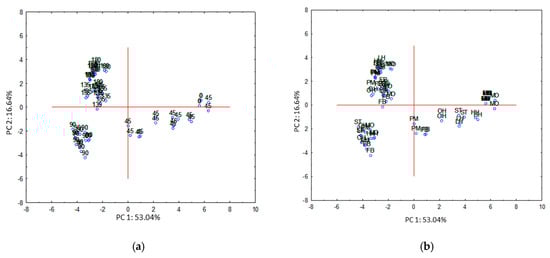 For the whole aging process, the first two components explained 67.68% of the total variability of the original data, accounting for 53.04% for the first component and 14.64% for the second one. Three groups related to the aging time (45 days, 90 days, and the last 3 months) could be distinguished (Figure 4a), but no differentiation was observed as regards the aging system (Figure 4b). This result agrees with those described in other studies, in which time was indicated as the most influential factor in the changes during aging, more so than the use of different woods or even different systems [38,39,40]. Thus, in this PCA, the greater distance, and therefore a higher evolution, was observed for wines from the first (45 days) and second (90 days) samplings, while there was almost no differentiation between 90, 135 and 180 days of aging according to the first component (PC1), though 90 days could be differentiated from 135 and 180 according to the second component (PC2) (Figure 4a). When all the aging period was considered, the wine evolved in a very different way depending on the aging system in the first 45 days; however, these differences disappeared with aging time (Figure 4b). The parameters that defined the PC1 were Abs620%, ACY and individual anthocyanins (Df-3-Gl, Cy-3-Gl, Pt-3-Gl, Pn-3-Gl, Mv-3-Gl, Mv-3-Gl-Py, Mv-3-Gl-Ethyl, Pt-3-Gl-Ac and Mv-3-O-Gl-Cm), in positive, and the CIELab parameters in negative (Table 4). The variables that most contributed to the differentiation in PC2 were the copigmentation parameters AL and PP, in positive, and COP in negative (Table 4). According to the distribution of the samples, the youngest wines (the initial ones and after 45 days of aging) were defined by the individual anthocyanins, but also by a higher Abs620%, since they were located in the positive PC1. During aging, there was a loss of monomeric anthocyanin [17], with the consequent interaction with other wine compounds, causing the generation of other colored compounds [14]. As aging progressed (after 90 days), wines maintained their L*, C* and H*. Additionally, such wines seemed to be related to the COP parameter, which could also be explained by parameter a*. Wines at the end of the aging period (after 180 days) were located in the negative PC1 and positive PC2, defined by AL and PP. This could be due to the decrease in anthocyanins and copigments [18,41].
