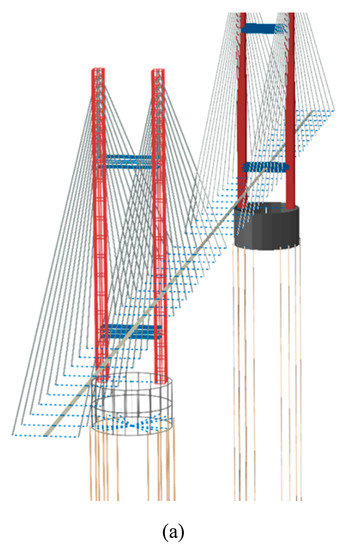 The tower of the analytical model is shown in Figure 7a. The cables showed a two-sided arrangement in the H-type tower of a single box type, as indicated in Figure 7b. The tower and girder used the beam element B31, and the girder was assumed to be mounted on the cross beam of the tower and connected using the ABAQUS [16] MPC-link option. In addition, a hinge connection was assumed between the girder and the cross beam of the tower.