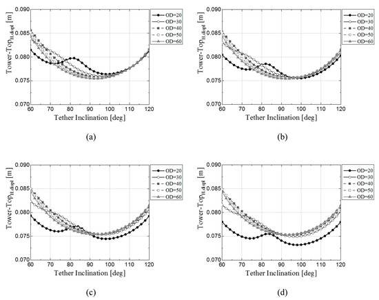The measuring point of the displacement is shown in Figure 12. The horizontal displacement of the lower part of the floater according to the tether slope and the diameter–buoyancy ratio of the floater is shown in Figure 13. As with the top horizontal displacement of the tower, the horizontal displacement of the bottom of the floater was also found to be sensitively affected by the slope of a specific tether according to the floater OD. Under the horizontal displacement of the floater, a clear trend of behavior was confirmed. In the case of horizontal displacement of the floating body, the amount of initial tension acting on the tether also increased with the buoyancy, and thus, the amount of change caused by the buoyancy did not appear much at the position where the tether was attached.