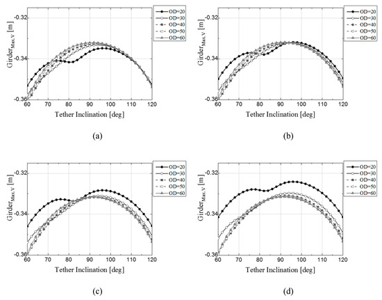 The maximum displacement of the girder center according to the tether slope and floater diameter–buoyancy ratio is shown in Figure 16. In the case of girder displacement, it was connected to the tower by the cable, and when the tower was supported by tethers, it was interactively affected by the vertical and horizontal displacements of the floater and tower. The unstable behavior of the girder displacement appeared at sensitive parts of the tether slopes in the horizontal displacement of the towers and floaters. In addition, at floater ODs of 20 m and 30 m, as the buoyancy increased, the horizontal and vertical displacements of the tower top decreased, which in turn decreased the maximum deflection of the girder.