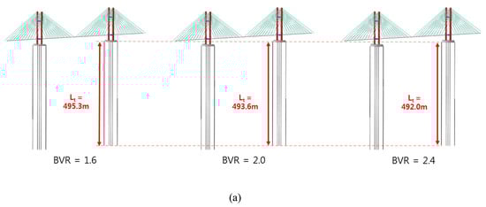According to the result graph shown in Figure 22, the displacement of the tower and girder decreased as the BVR increased (increased axial stiffness of the tether). Figure 22(c) shows that, at BVR = 1.8, the effect of increase in the axial stiffness of the tether was greater than that of the increase in the floater OD, due to an increase in the rotational stiffness produced by the tether. At a small BVR (below 1.8), the vertical displacement of the girder was reduced due to the increase in OD, while at a larger BVR (over 2.0), it decreased with the OD due to an increase in the axial stiffness of the tether.