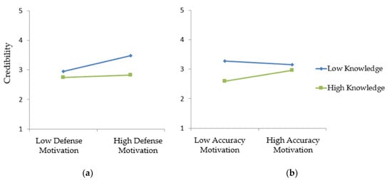 Interaction effects: (a) Interaction effect of defense motivation and knowledge on claim credibility; (b) interaction effect of accuracy motivation and knowledge on claim credibility.