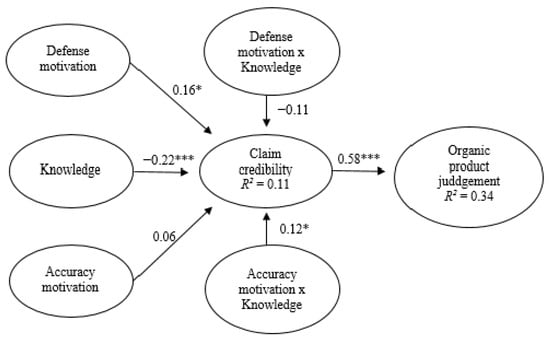 Table 4 also includes the indirect effects of all exogenous variables in the model on organic product judgement, through the mediating role of claim credibility. Coherently with the results commented previously, claim credibility was found to mediate the negative effect of knowledge (β = −0.13, p < 0.001), the positive effect of defense motivation (β = 0.09, p < 0.05), and the interactive positive effect of accuracy motivation and knowledge (β = 0.07, p < 0.05) on organic product judgement [].