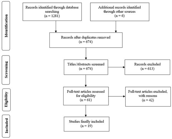 A review of the literature was conducted following the guidelines of the Cochrane Collaboration and taking into consideration the guidance provided by previous studies focused on scoping reviews [,]. This design (i.e., scoping review) was selected in order to have a broader approach with the aim of mapping literature characterized by a variety of study designs. Additionally, findings were reported in accordance with the Preferred Reporting Items for Systematic Reviews and Meta-Analyses (PRISMA) for scoping reviews [].