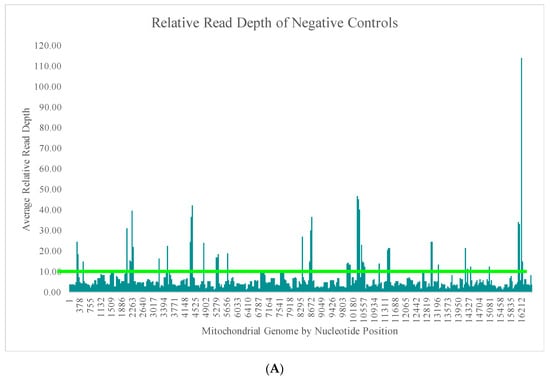 The average read depth of these 70 negative controls ranged from 13.1X (±24.5X) to 689.7X (±2315.7X) across the mtGenome. The average read depth was below 200X for 84.8% of the mtGenome. Due to the quantitative nature of MPS data and the thresholds used for data analysis, the relative read depth (i.e., the read depth of the negative control compared to the read depth of a positive control in the same run for each nucleotide position) was evaluated. The average relative read depth for the 70 negative controls ranged from 1.3% (±1.9%) to 113.9% (±555.3%) across the mtGenome (Figure 4A). The average relative read depth was below 10% for 93.9% of the mtGenome. The remainder of the mtGenome rose above this 10% threshold in amplicons that were smaller than the 163 bp average size of the targeted amplicons generated by this panel suggesting the majority of these reads did not span their respective amplicons. Figure 4B–E illustrate the likely origin of these reads by focusing in on two regions containing the highest read depth (nucleotides 16,000 through 16,569 and nucleotides 10,000 through 10,500). These short reads, compared with the locations of targeted amplicons (horizontal bars in Figure 4B,D), are likely unused primer, short alternative PCR products generated by mismatched amplicons, or the overlapping regions of targeted amplicons.