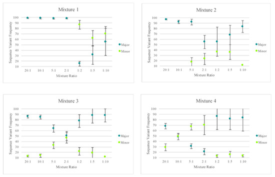 The average sequence variant frequency (and standard deviations) for the major and minor contributor included in each mixed haplotype. Only one of the replicates for mixture series 5 was included in order to allow the standard deviations to reflect variability in the sequence variant frequencies of one mixture instead of reflecting the variability across several mixtures. The Y-axis starts at 10 to reflect the 10% point heteroplasmy threshold used for analysis.