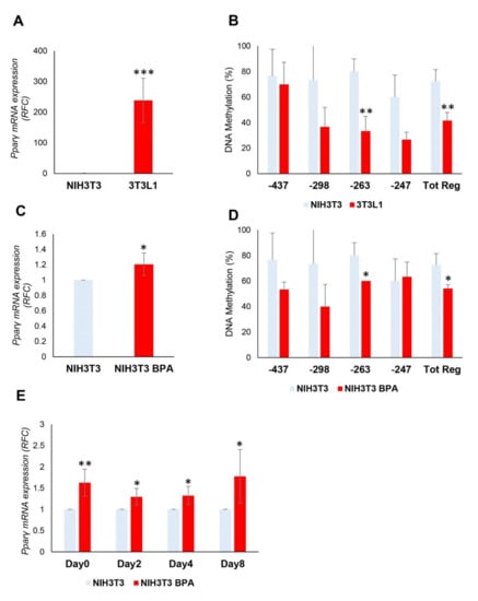 Successively, NIH3T3 cells have been treated at a low dose of BPA (1 nM) for 8 days to assess whether BPA also regulates Pparγ DNA methylation in non-adipogenic NIH3T3 cells. As shown in Figure 4C, the mRNA expression of Pparγ was significantly increased by BPA treatment in NIH3T3 fibroblasts (1.2-fold increase, p < 0.05). We also tested the ability of BPA to remove the transcriptional block imposed on the Pparγ gene in the NIH3T3 cells. Even in NIH3T3 cells, the DNA methylation of the Tot. Reg. of the Pparγ promoter (Figure 4D) was reduced by BPA exposure (CpG methylation %: 72.5 (NIH3T3) versus 54.2 (NIH3T3 BPA), p < 0.05).