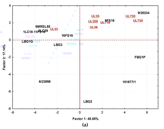 Figure 7a,b show, respectively, the loading plots of strain cultures in milk at 30 °C and the volatile compounds produced in the plane defined by principal components 1 (Factor 1) and 2 (Factor 2). In this case, Factor 1 described the 45.85% variance among samples while Factor 2 accounted for 17.14%. Additionally, in this case, samples obtained by STELA collection, with the exception of UL33, grouped together, including samples from 9/20234 and 9FS16. This group, separated from other strains along Factor 1 and Factor 2, was affected by 2,3-butanedione, 3-hydroxy-2-butanone, 2,6 dimethyl heptanone, 4-methyl isobutyl ketone, 5-ethyl-3-nonanol, 2-methyl-3-pentanol, 3-penten-2-one-4-methyl. Samples from LBG2, 101877/1, and FBG1P tended to group together and the compounds affecting this were phenylethyl alcohol, acetone, benzaldehyde, benzenacetaldehyde, 3-methyl butanal, 2,6-dimethyl heptanol. The grouping of the remaining samples (UL33, 6MRSL55, 1LC18, 3LC39, 11FS16, LBG1G, and LBG3) was affected by ethanol, 2-methyl-1-propanol, acetaldehyde, hexanoic acid, and butanoic acid.