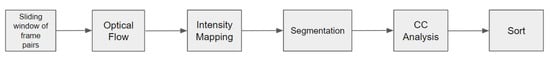 The proposed unsupervised, modular, flexible, and efficient work flow was implemented in Python and is shown in Figure 2. It should be emphasized that the raw video quality in DSIAC videos is poor and contrast enhancement is critical for optical flow methods. In the Appendix A, we include a comparative study of some simple and effective enhancement methods to generate high-quality videos out of the raw videos. There are a number of steps in the proposed workflow. First, frame pairs are selected. In our experiments, the two frames are separated by 19 frames. This was done in order to increase the motion of the target. If adjacent frames are used, the motion in the DSIAC dataset is too subtle to notice. Second, optical flow algorithms are used to the frame pairs to extract the motion vectors. In our experiments, we have compared two algorithms: TV-L1 [] and Brox []. Third, the intensity of the optical flow vectors is computed and used for determining moving pixels. Fourth, the intensity of the optical flow is thresholded based on the mean and standard deviation of the flow intensity. Fifth, a connected component (CC) analysis is performed to the segmented image. Finally, the detected areas are jointly analyzed using a Simple Online and Real-time Tracking (SORT) algorithm []. Details of each step are shown below.