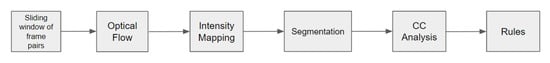Because of these inherent issues of using SORT, we revisited the original pipeline (Figure 2) and revised it to the flow shown in Figure 5 to see if we could further improve the overall system performance. The majority of the pipeline was left intact, but the rules analysis module shown in Figure 5 was revised. In particular, we updated the sequencing of the rules analysis module. One of the issues with the earlier rules module was that it placed more emphasis on the maximum intensity of a connected component than its location. Our initial assumption was that the target would consistently have the highest optical flow value. Although this assumption is true to a certain extent, there are still a significant amount of cases that did not follow this assumption. Instead, the focus should be on finding relatively high intensity components in a tight range around previous detections.