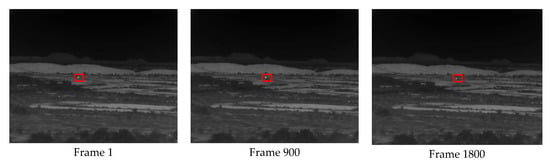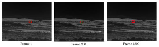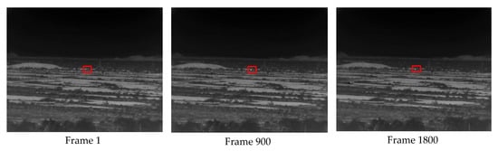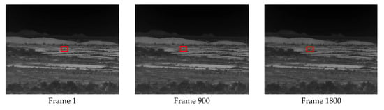 We used four videos in the DSIAC dataset []. There are MWIR daytime and night-time videos ranging from 1000 to 5000 m in 500 m increments. We selected four daytime MWIR videos in the following ranges: 3500, 4000, 4500, and 5000 m. Figure 7, Figure 8, Figure 9 and Figure 10 show several frames from each video. It should be noted that contrast enhancement has been applied to these videos. A comparison of five different contrast enhancement approaches was carried out and the results are summarized in the Appendix A. It can be seen that the vehicles (small bright spots inside the red bounding boxes) are hard to see and are quite small in size.