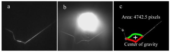 The first image processing path is as follows. The region of interest (ROI) is normally used to reduce the influence of the interference data on WSP extraction and the computational burden []. There is a complete arc region in the image (Figure 3a), and it has the maximum intensity. The global binarization is first conducted with the maximum intensity (Figure 3b). Then, the region below the bottom boundary of the arc region is the ROI in this work (Figure 3c).