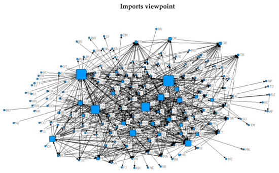 The visualisation of WTN (2014–2018) network is displayed in Figure 1 (using NetDraw, a software included within the UCINET 6.0 Package, [40]). To reduce clutter, the arcs have been filtered so that only those with a weight above the third quantile (Q3) have been retained. Importing and exporting are depicted in Figure 1. Thus, in the top panel, to emphasise imports, the sizes of the nodes are proportional to the in-degree, while in the bottom panel exports are emphasised and the node sizes are proportional to their out-degree. ISO 3166-1 alpha-2 country codes are used to designate the countries. Countries with a major importer role, are Iran, Yemen, Morocco, Italy, Spain, Germany, Turkey and United Kingdom, among others. Exporting countries with a large number of trading partners include the US, Canada, Australia, Russia, France and Germany, among others. Note that it is not uncommon for a country to be involved simultaneously in imports and exports. The WTN (2014–2018) shown in Figure 1 can be compared with that of 2009–2013 shown in [10].