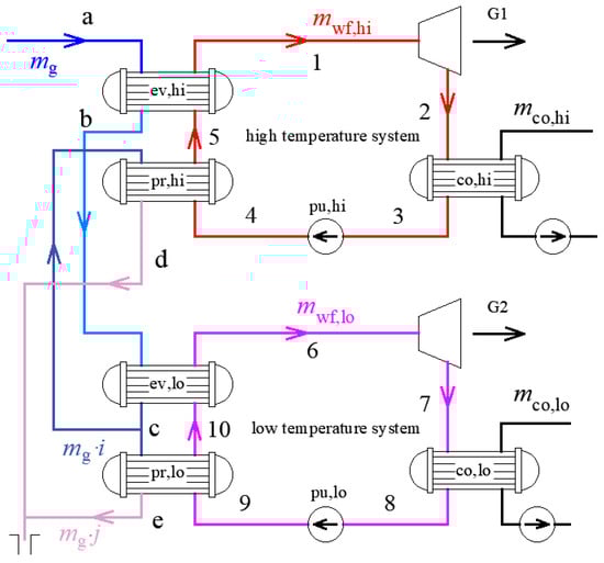 Schematic diagram of the two-stage organic Rankine cycle (ORC) system.