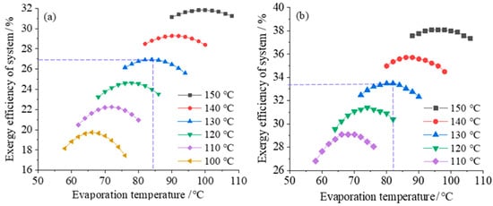 Exergy efficiency varies with evaporation temperature: (a) for the single-stage ORC system, (b) for the regeneration ORC system.