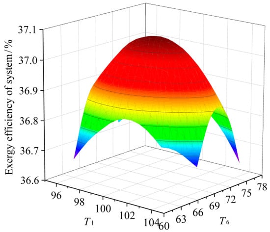 Figure 4 shows the exergy efficiency of the two-stage power generation system varying with the evaporation temperature (T1, T6) of the organic working fluid in the high and low temperature systems when the heat source temperature is 130 °C and the mass split ratio of the high temperature system preheater is 0.65. It can be seen that as the evaporation temperatures of the working fluid in the high-temperature system and the low-temperature system increases, the exergy efficiency of the system has a maximum value, that is, at a certain heat source temperature, the exergy efficiency of the system is affected by both the high and low temperature systems. When the evaporation temperatures of the organic working fluid in the high and low temperature systems are 100.1 °C and 69.8 °C, respectively, the system reaches a highest exergy efficiency of 37.0%. Compared with the single-stage system and regenerator system under the same parameters, the exergy efficiency of the system is increased by 10.1% and 3.8%, so the two stage system exergy efficiency is higher, which is consistent with Safarian S et al. [] and Kaşka Ö et al. []. The increase in exergy efficiency is mainly due to the more optimized matching of the temperature curves of the hot and cold fluids in the heater and condenser of the two-stage system, which reduces the loss of available energy of the components, thereby increasing the exergy efficiency of the system.