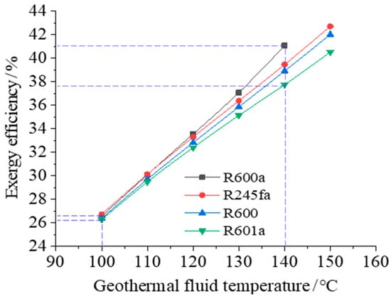 With high heat source temperature, the exergy efficiencies of the system for different working fluids are quite different, indicating that the selection of suitable working fluid can improve energy utilization. For example, when the heat source temperature is 140 °C and the working fluids of the two-cycle system are R600a and R601a, the exergy efficiencies of the system are 41.1% and 37.7%, respectively, with a relatively large difference. When the heat source temperature is 100 °C, the corresponding system exergy efficiencies are respectively 26.6% and 26.3%, respectively, with a very small difference.