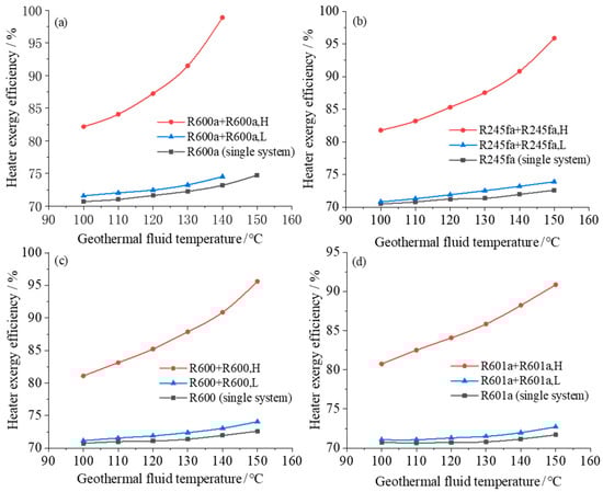 Heater exergy efficiency varies with geothermal fluid temperature in both single system and dual system with different working fluids: (a) R600a; (b) R245fa; (c) R600; (d) R601a.