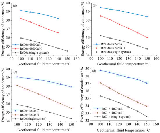 Exergy efficiency of condenser varies with geothermal fluid temperature in both single system and dual system with different working fluids: (a) R600a; (b) R245fa; (c) R600; (d) R601a.