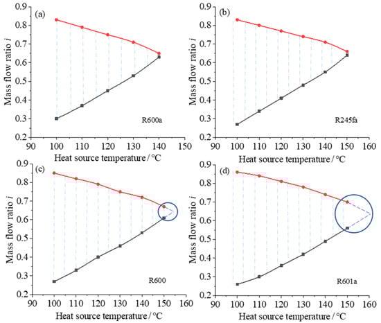 It can be seen from Figure 8 that when the geothermal temperature increases, the range of the split ratio (shown by the blue dashed lines) becomes smaller, and the trend of the split ratio for different working fluids all presents an isosceles triangle shape. The split ratio chart shows that the applicable heat source temperature ranges for different working fluids are different: the split ratio range is large at low temperature, and the split ratio range becomes smaller at higher temperature until the working fluid is no longer applicable. For example, R600a is suitable for low-temperature heat sources below 140 °C, and R601a is suitable for higher heat source temperatures, the suitable heat source temperature of R245fa and R600 is between them. This conclusion is consistent with the previous analysis. Since the maximum heat source temperature in the current analysis is 150 °C, the predicted applicable range is shown by the dashed line in Figure 8c,d. The main reason for the change of the split ratio range with the heat source temperature is that when the heat source temperature is low, the working fluid flow rate is relatively reduced, so the heat required for heating in the preheater is correspondingly reduced, resulting in a decrease of the flow distribution for the heat source. The applicable range of different working fluids at high temperatures is mainly determined by the physical properties of the working fluids.