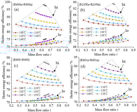 Relationship between heater exergy efficiency and mass split ratio for different working fluids: (a) R600a + R600a; (b) R245fa + R245fa; (c) R600 + R600; (d) R601a + R601a.