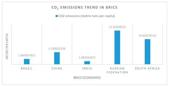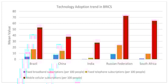 The data suggest that all the BRICS countries are included in the top 15 most polluting countries. Three of them, China, India, and Russia, are found in the top four emission-generating countries []. Concerning an average per capita emission generation, Russia is on top of the BRICS group, followed by South Africa, China, Brazil, and India (Figure 1). China and India have less per capita emissions due to the large population as compared to other BRICS countries. Figure 2 depicts the recent technology adoption trend in BRICS economies.