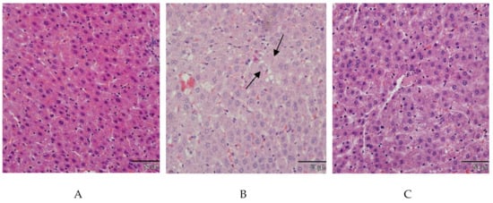 Histopathological analysis of liver (scale bar 50 µm) for the (A) NC group, (B) PC group, (C) DC group, (D) T I group, (E) T II group, and (F) T III group. NC: normal control; PC: positive control; DC: drug control; T I: treatment 1 (10 mg·kg−1); T II: treatment 2 (100 mg·kg−1); T III: treatment 3 (200 mg·kg−1).